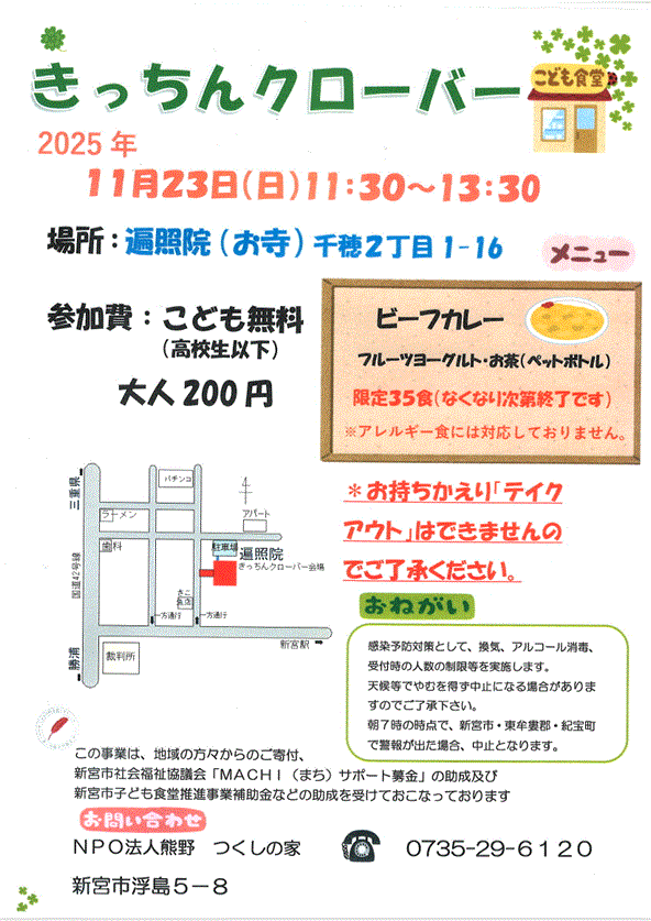 | きっちんクローバーを遍照院にて開催いたします。時間は11時30分からとなっております。 メニューはビーフカレーとフルーツヨーグルトです。です。35食ご用意しております。 どなたでもお越しいただけますので、お気軽にどうぞお立ち寄りください。 |