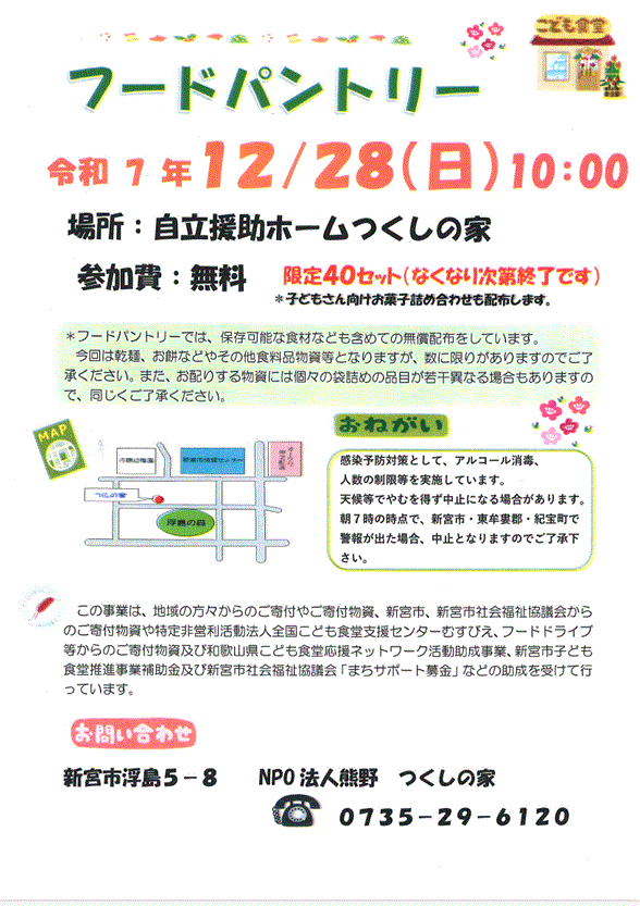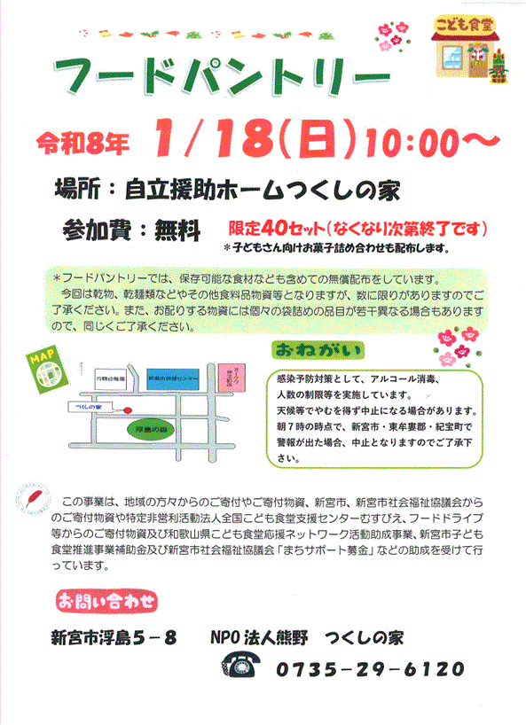 | フードパントリーをつくしの家で行います。40セットご用意しております。無くなり次第終了となります。開始は10時となっておりますので、お早目にお越しいただくのはご遠慮ください。 |