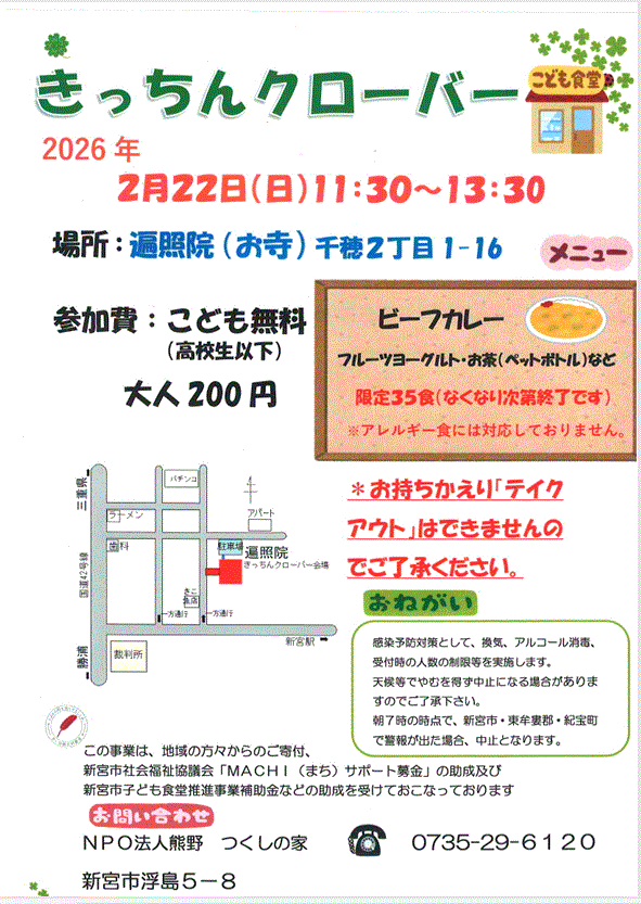 | きっちんクローバーを遍照院にて行います。35食ご用意しております。無くなり次第終了となります。開始は11時30分となっております。どなたでも参加いただけます。是非お越しください |