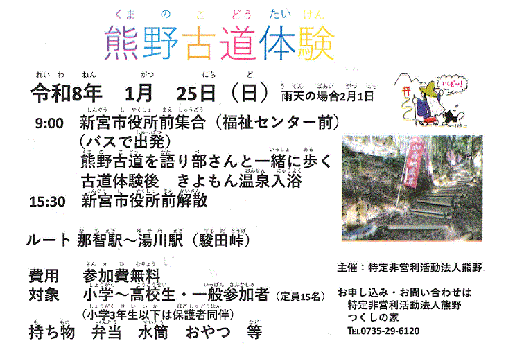 ![]() 熊野地方には、昔から熊野三山にお参りする為の熊野古道があります。 熊野古道を語り部さんと一緒に歩き、熊野古道の理解を深める事は地域の再発見的な体験となるでしょう。 今回は、数多くある熊野古道ルートより大辺路 駿田峠(那智駅〜湯川駅)を計画しました。 古道体験後、きよもん温泉に入浴して帰って来ます。参加費は無料です。 皆様の参加を待ってます。 |